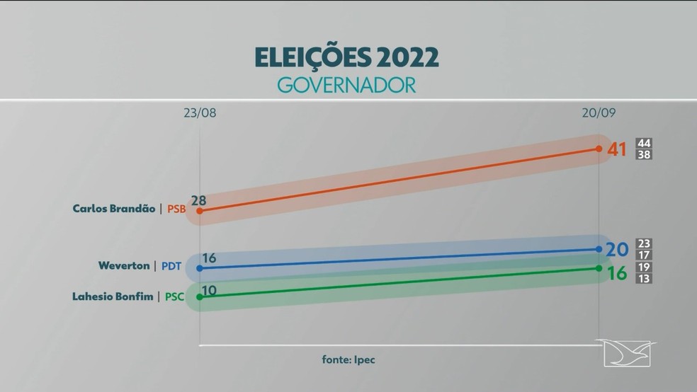 Carlos Brandão (PSB), Weverton Rocha (PDT) e Lahesio Bonfim (PSC) lideram as pesquisas para o governo do Maranhão — Foto: Grupo Mirante/Paulo Soares/Matheus Soares partir segunda pesquisa Ipec, divulgada nesta terça-feira (20) pela TV Mirante, mostra os índices de intenção de voto para o governo do Maranhão. O candidato Carlos Brandão (PSB), mantém a liderança com 41%.